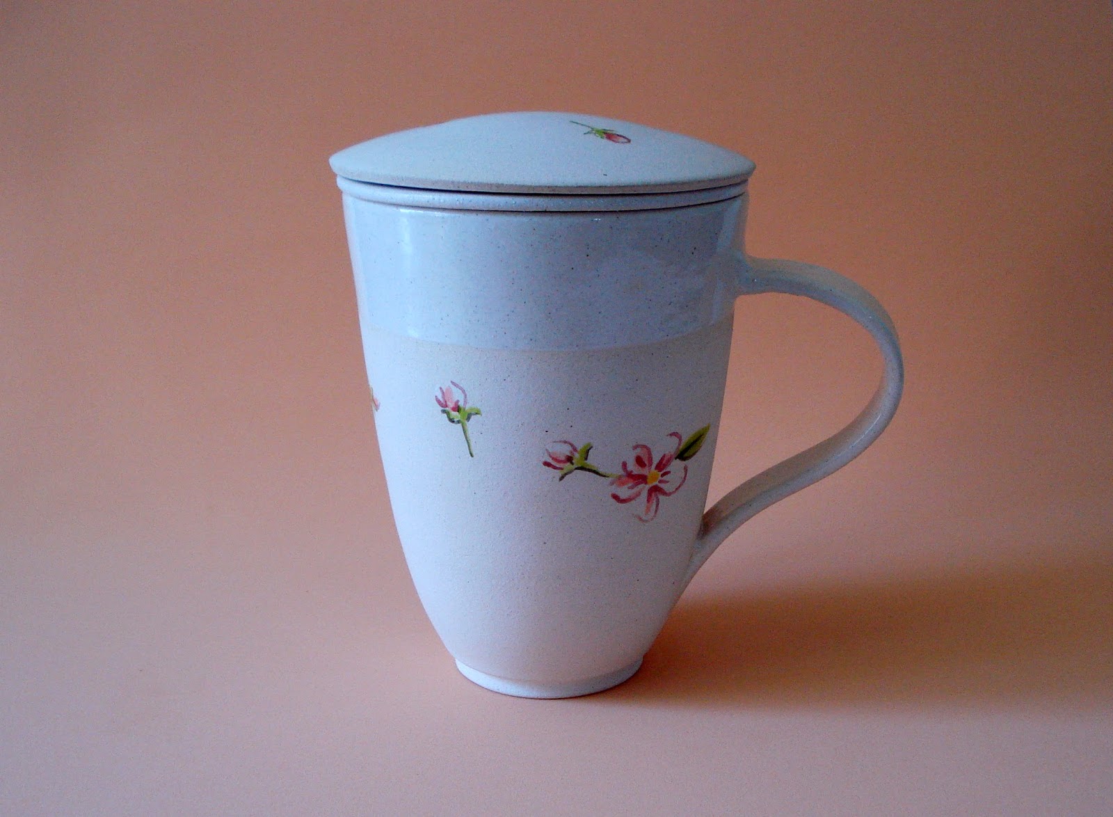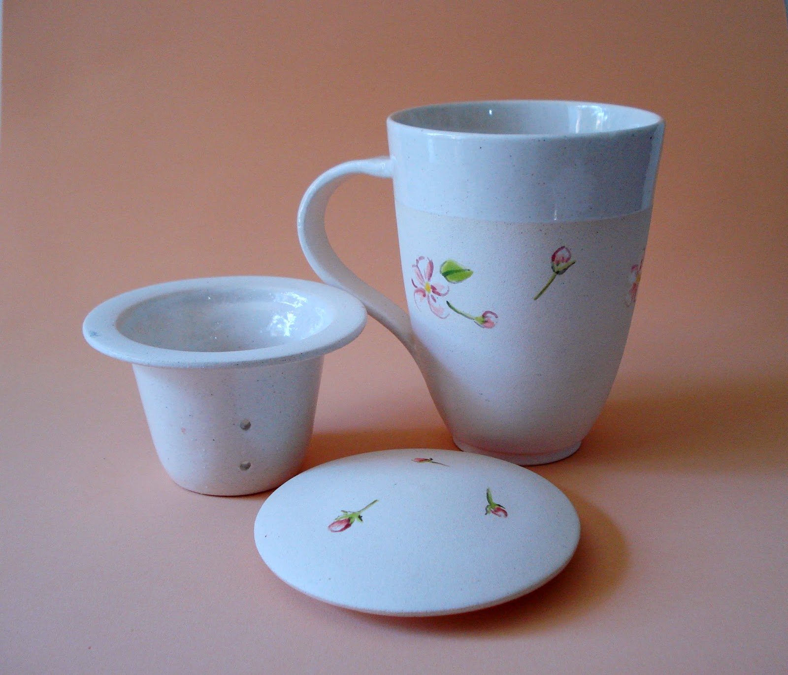 Caneca para chá com coador e tampa, desenho de flor de maça..