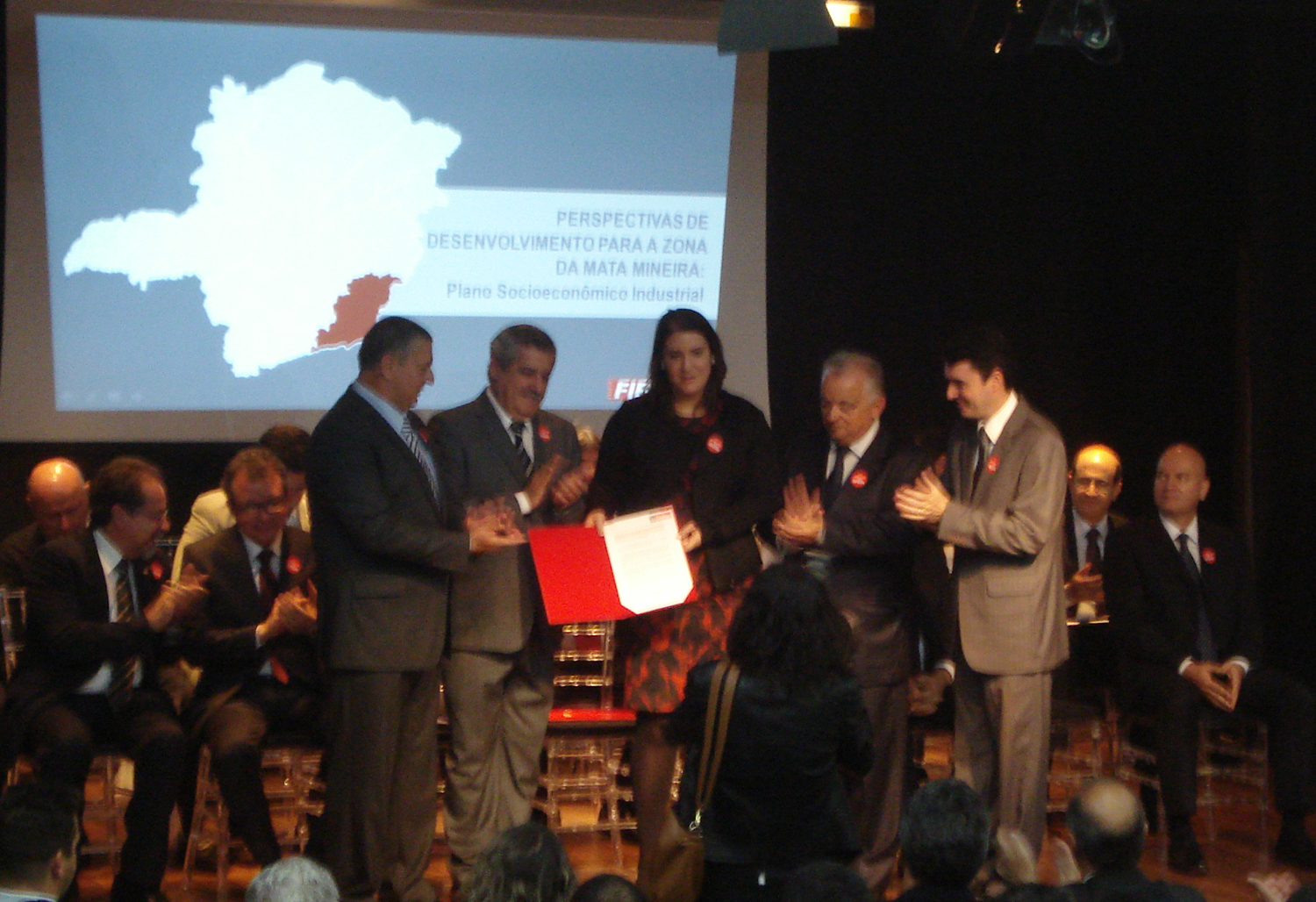 Momento do recebimento do documento com: Francisco Campolina (presidente da Fiemg Regional), Fernanda Machado (CODEMIG), Olavo Machado Junior (presidente do Sistema Fiemg) e o Prefeito Bruno Siqueira.