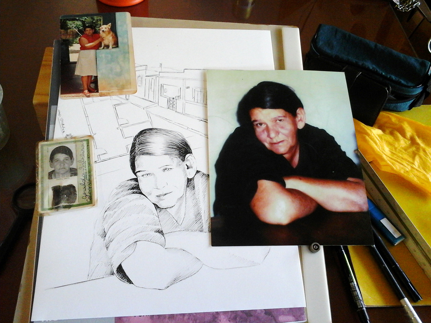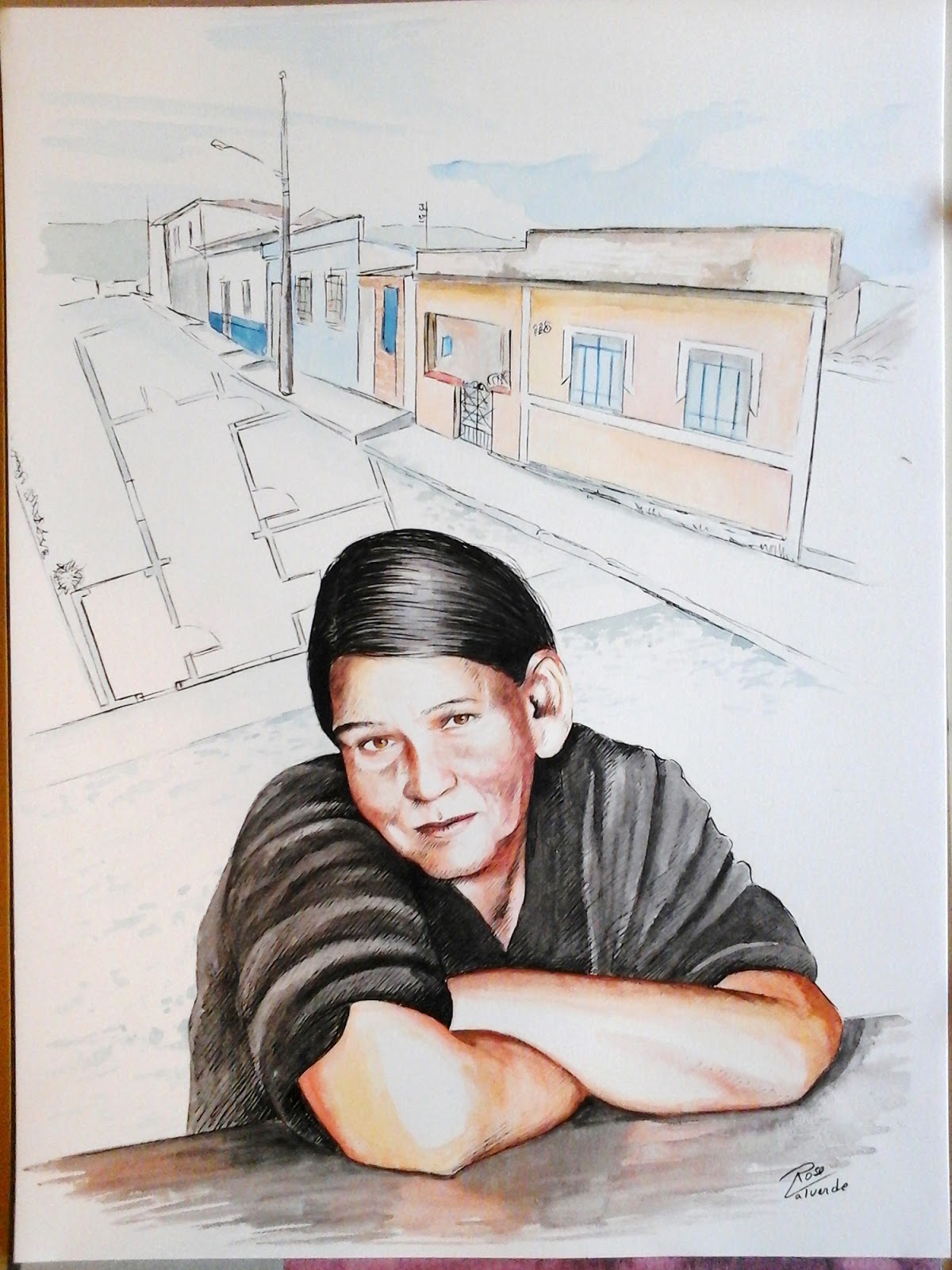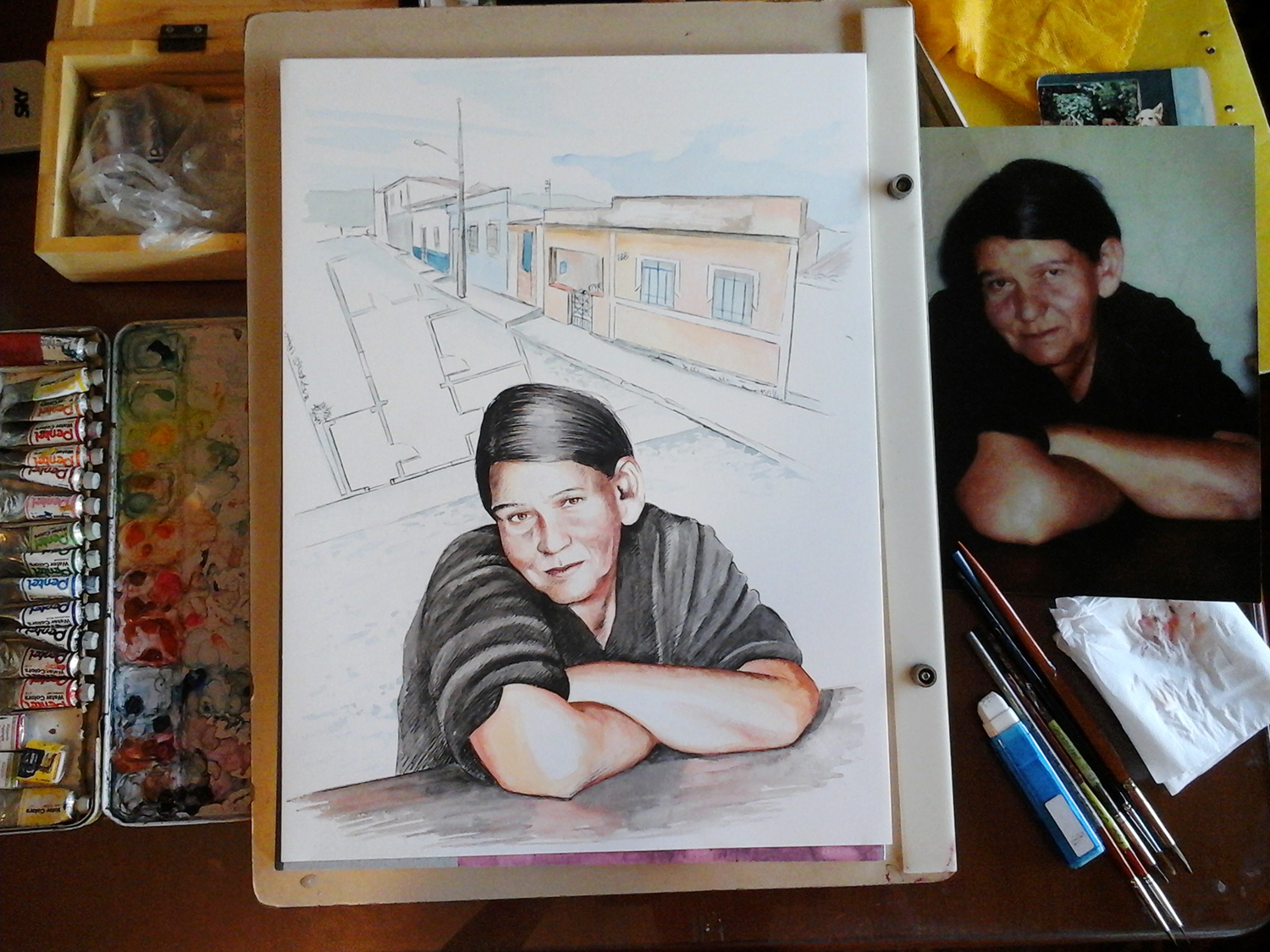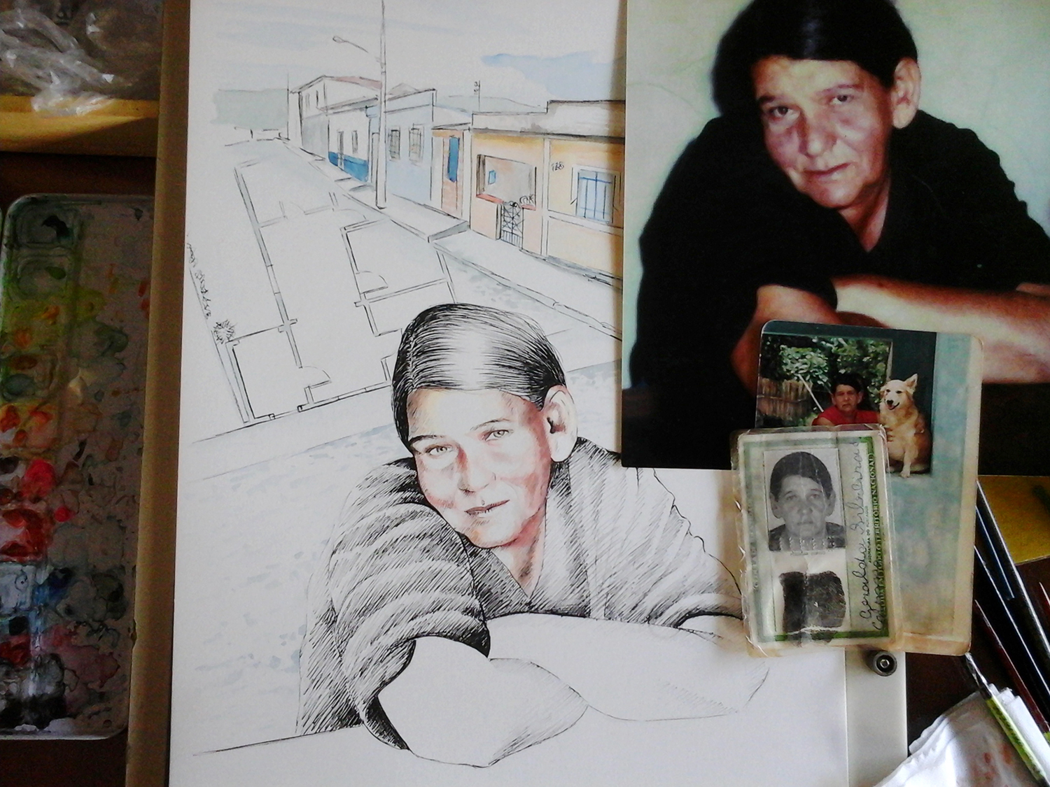 Vale mostrar aqui o processo de confecção do retrato que está em nosso show room e que mostra a Dona Zizinha, sua casa ao fundo e o esboço que fiz da planta da casa que ela morava.