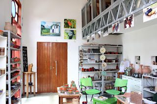 Procuramos criar dois módulos distintos, a residência na parte posterior do terreno e a loja na parte frontal. Para os ateliers, projetamos um mezanino explorando a plástica do telhado, tanto sobre a parte residencial onde fica o atelier de desenho e pinturas, como sobre a loja onde fica o atelier de peça cerâmicas, que tem acesso aos visitantes da loja, estes ligados por um terraço usado para a secagem de cerâmica e que protege o espaço entre a residência e a loja, que serve de área de convivência e exposição de produtos, bem como reserva um espaço para guarda de um veiculo do casal em frente ao acesso lateral. Anexo à loja deixamos um espaço para deposito e oficina e chegada de matéria prima.